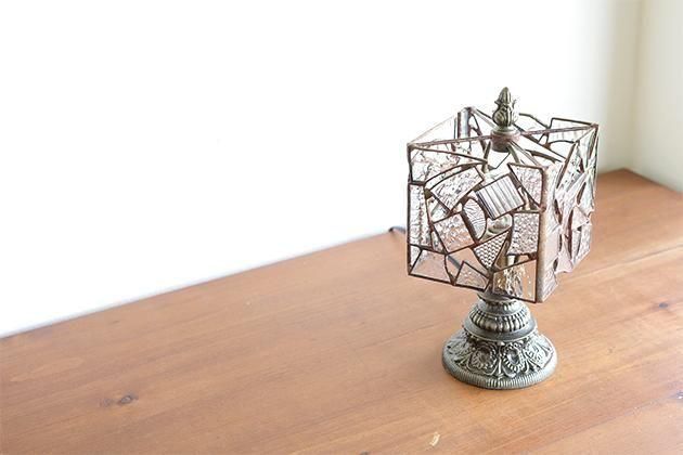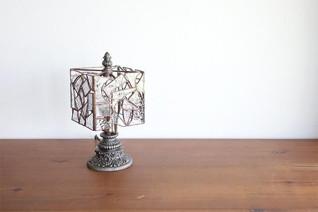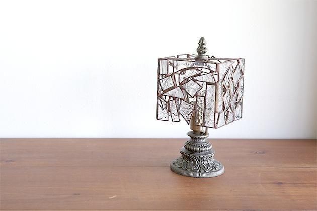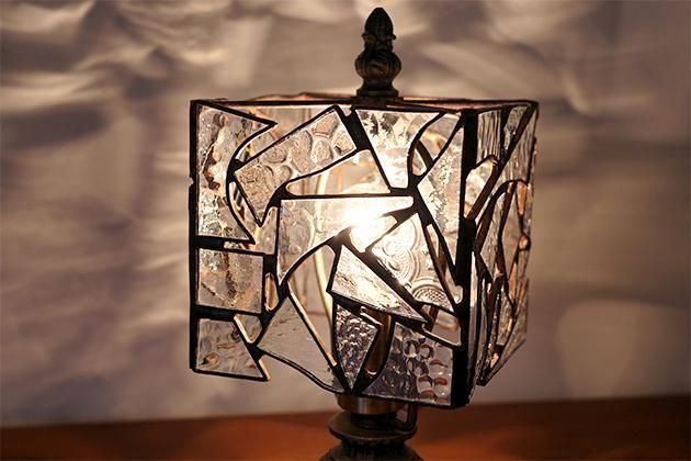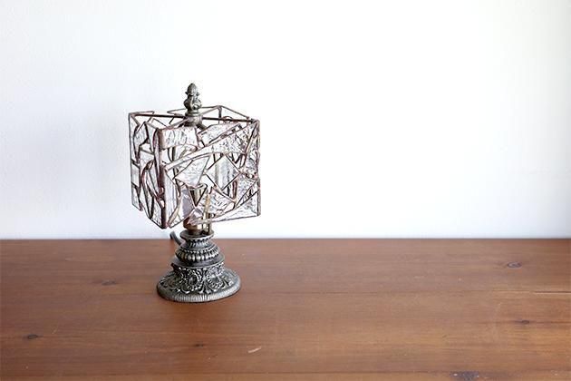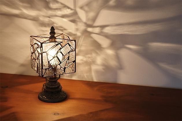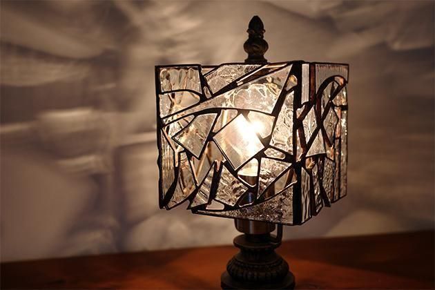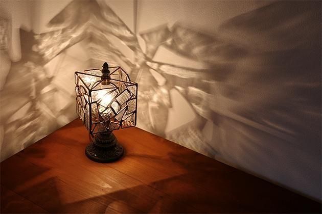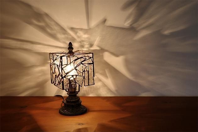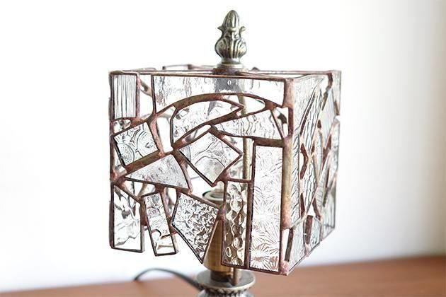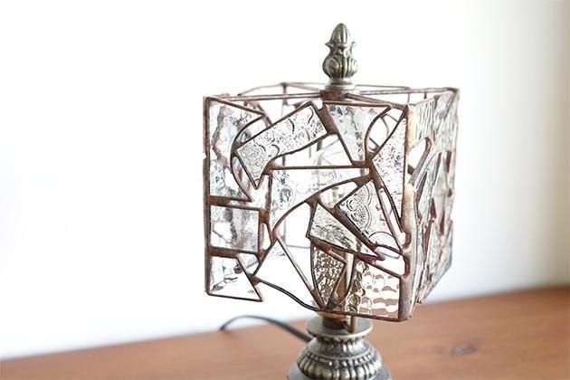 ステンドグラスのテーブルランプ、ガラスのかけらランプ Kakera square clear(カケラ スクエア クリア)です。様々なテクスチャーのクリアガラスを用いて作ったランプです。色々な形のガラスのかけらを集めて作りました。明りを灯すと、どの面も違った表情で、幻想的な輝きを映し出します。飽きの来ない、ガラスの美しさが際立つデザインです。小ぶりなランプですので、置く場所を選ばずお使い頂けます。 こちらのランプは、ガラスのかけらを集めて作っているため、すべて1点もののランプとなっています。ガラスのかけらの形は全く同じものがないため、ガラスの組み合わせはランプ1点1点全て異なります。そのため、商品画像と商品のガラスの種類や配置は、すべて異なることをご承知おきくださいくださいませ。 できるだけランプの雰囲気が変わらないようにするため、色の配分や全体の雰囲気は同じになるようにお作りしています。これを世界に一つだけのランプと思っていただき、楽しんでいただけたら幸いです。 こちらの商品は全国送料無料です。