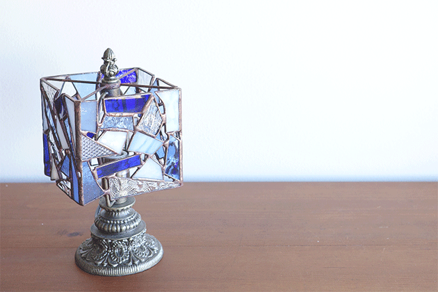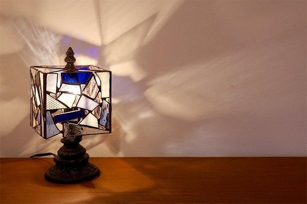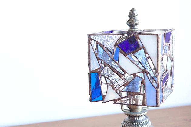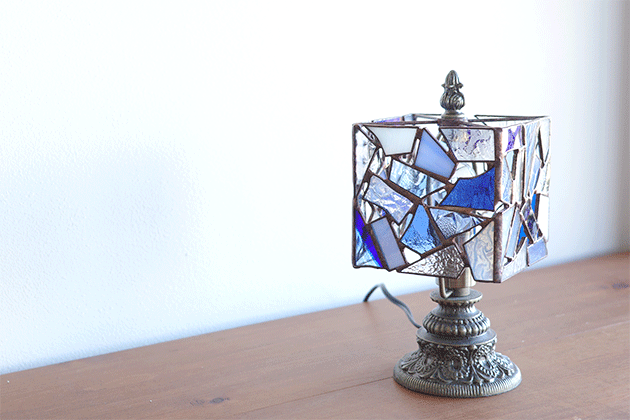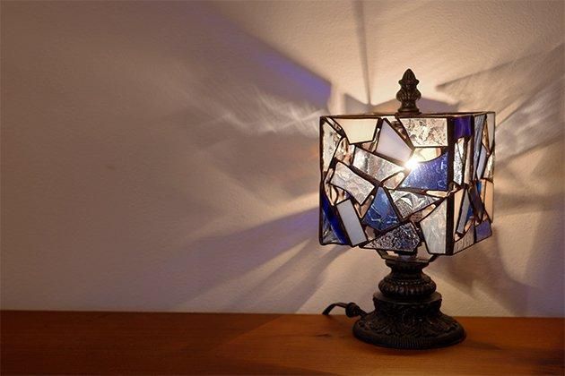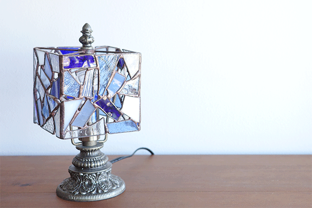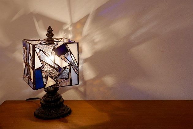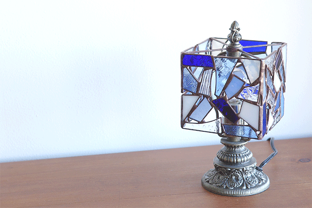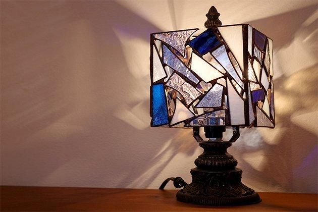 ステンドグラスのテーブルランプ、 「Kakera square blue(カケラ スクエア ブルー)」です。