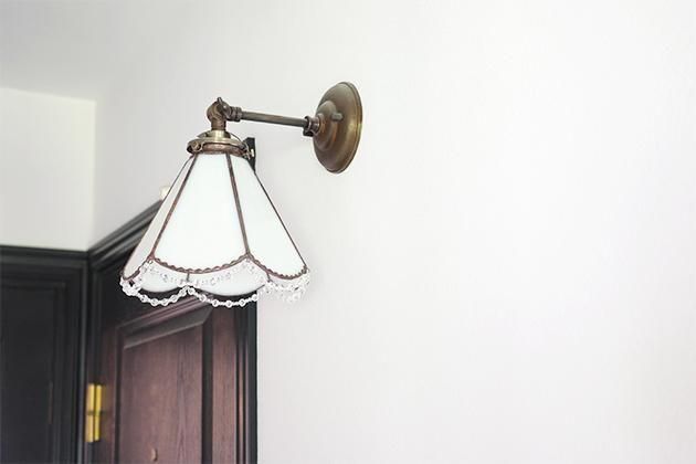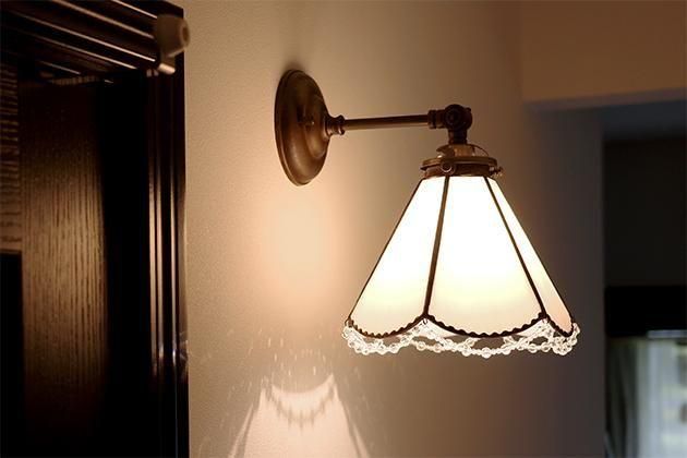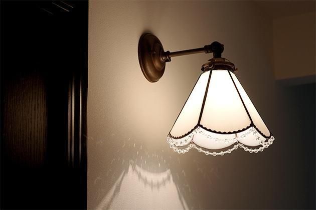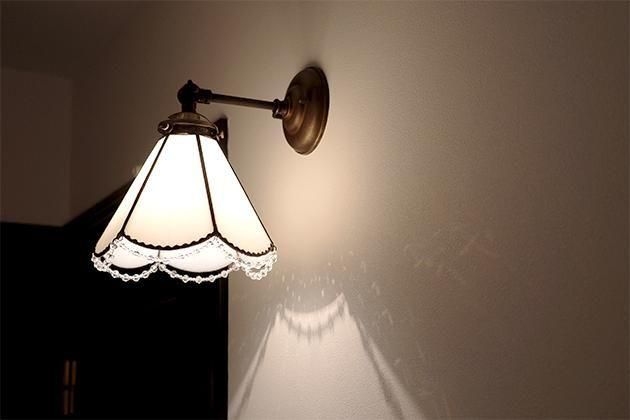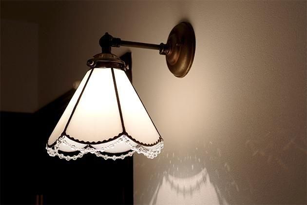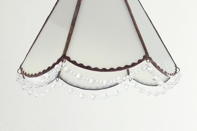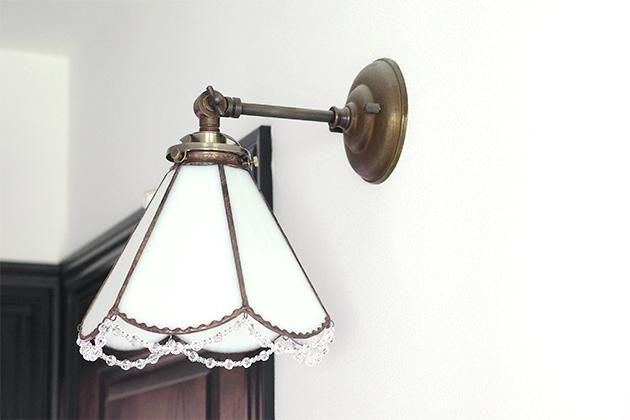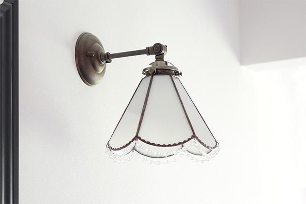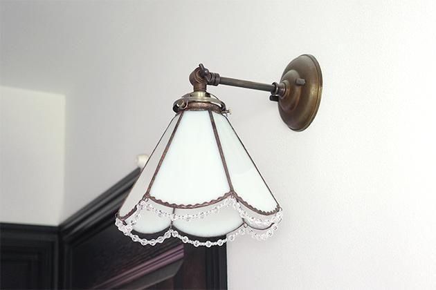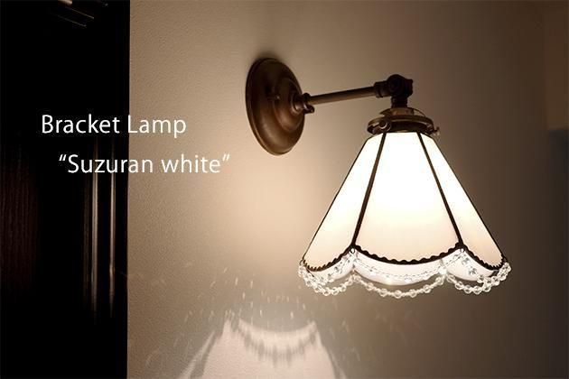 ステンドグラスのブラケットランプ、Suzuran すずらんです。幸せの花すずらんを型どった可愛らしいランプ”すずらん”がブラケットランプになりました。真っ白なガラスのみで作ったランプの裾にビーズをあしらい、上品でエレガントな感じに仕上がっています。廊下や階段、玄関などにお使い頂きますと、インテリアのアクセントにもなり、優しい空間が広がります。